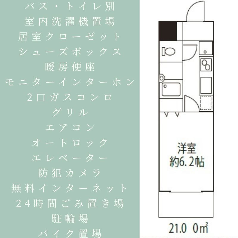 バス・トイレ別、室内洗濯機置き場、エアコン、オートロック、エレベーター、 駐輪場、バイク置き場、敷地内ごみ置き場、24時間ゴミ出し可、システムキッチン、グリル、2口コンロ、都市ガス、インターネット無料、モニタ付インターホン、防犯カメラ、収納スペース、シューズボックス、フローリング、バルコニー、分譲タイプ